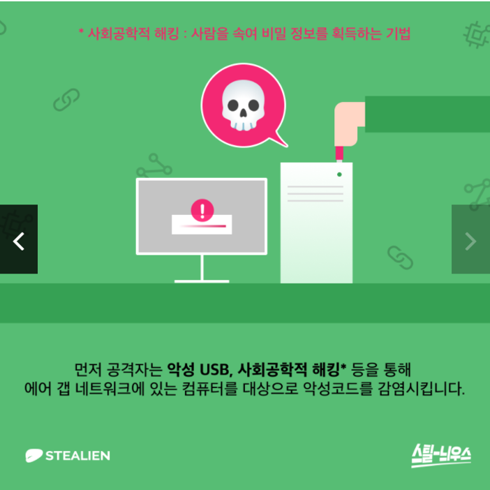 ① 에어 갭 네트워크 환경에 있는 컴퓨터에 악성코드 심기 ( 악성 USB, 사회공학적 기법 등 )
