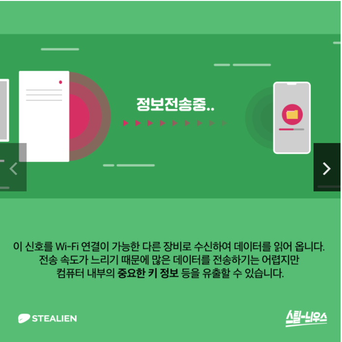 - 에어 갭 네트워크 환경에 있는 컴퓨터에서 Wi-Fi 신호를 강제로 발생시켜 데이터를 탈취하는 공격 기법