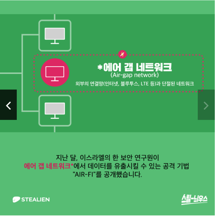 - 12월 이스라엘의 한 보안 연구원이 에어 갭 네트워크 환경에서 데이터를 유출시킬 수 있는 공격 기법인 AIR-FI를 공개했다. 해당 방법을 이용하여 별도 와이파이 기능이 없는 컴퓨터에서 와이파이 신호를 발생시켜 외부 접근이 가능하도록 만들었다. 해당 공격 기법에 의한 사례는 존재하지 않지만, 악용될 가능성이 충분히 있으며 해당 공격에 대비할 수 있는 방법을 고안해두어야 할 것이다.